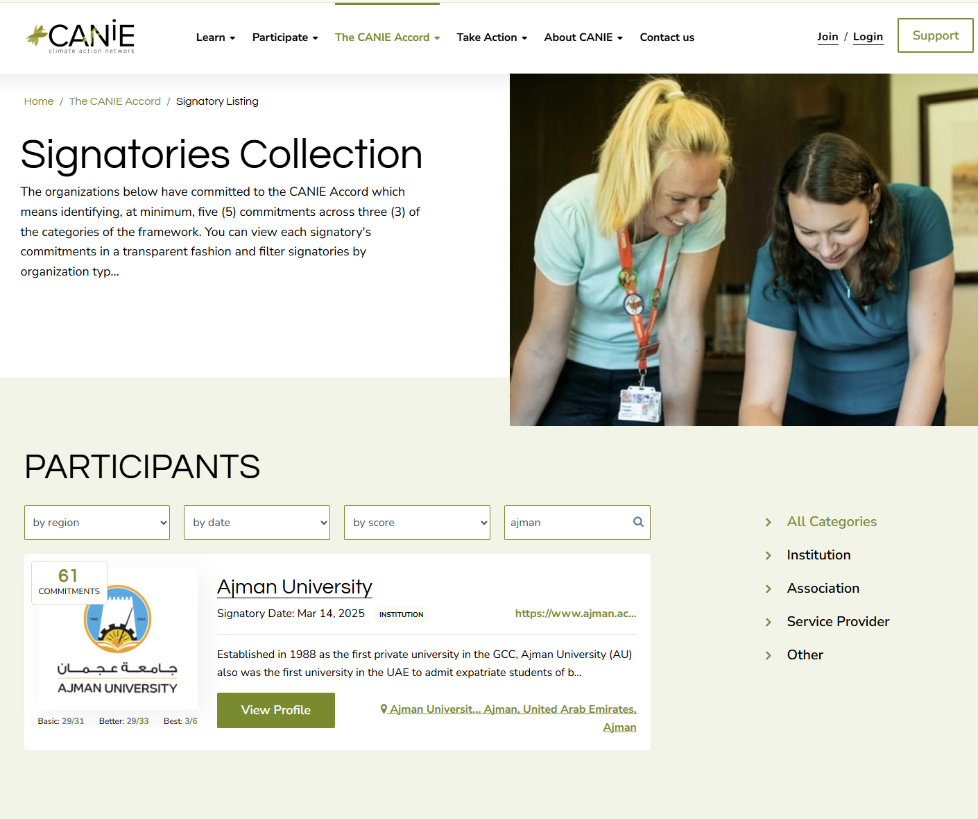 According to the official CANIE signatory listing, Ajman University has committed to 61 actions across five thematic areas, demonstrating comprehensive engagement with the Accord’s framework. The University achieved full completion under Leadership and Influencing and Climate Education, while advancing measurable progress in Emissions Accounting, Travel, and Sustainable Operations.