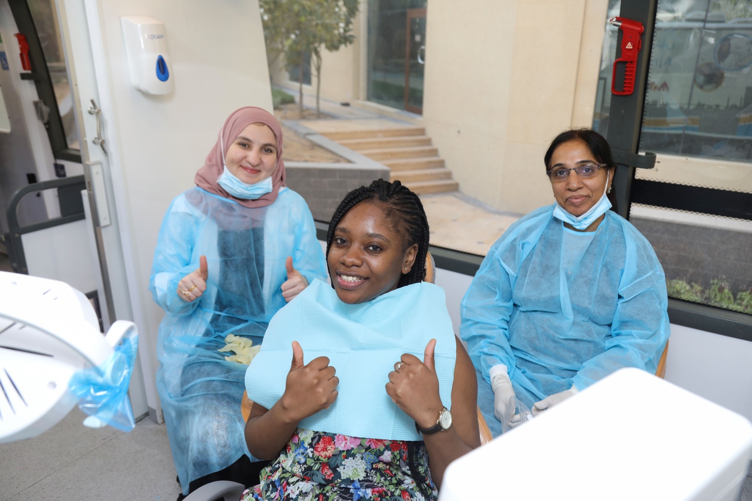 The modern mobile dental clinic includes two built-in dental units, a wheelchair carrier lift, an X-ray machine and a sterilization device. The AU dental team comprises several volunteers from alumni, resident dentists and student trainees who have been thoroughly trained and prepared for the fieldwork on the importance of oral hygiene.